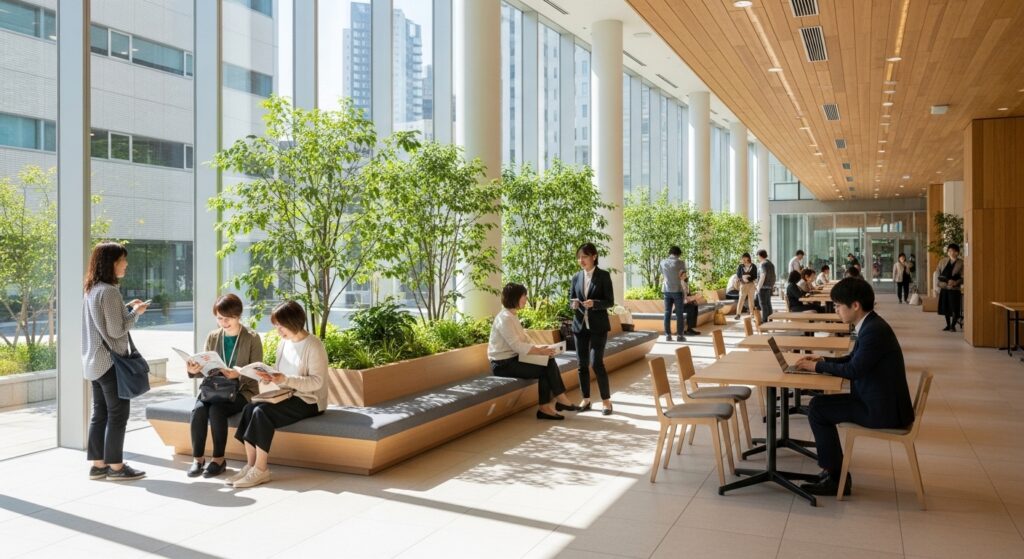 レイアウトの工夫:大型テーブル席・個別ブース・会議スペース・集中スペースなど、多様なワークシーンに対応できるゾーニングを行うことで、使われ方の幅が広がります。